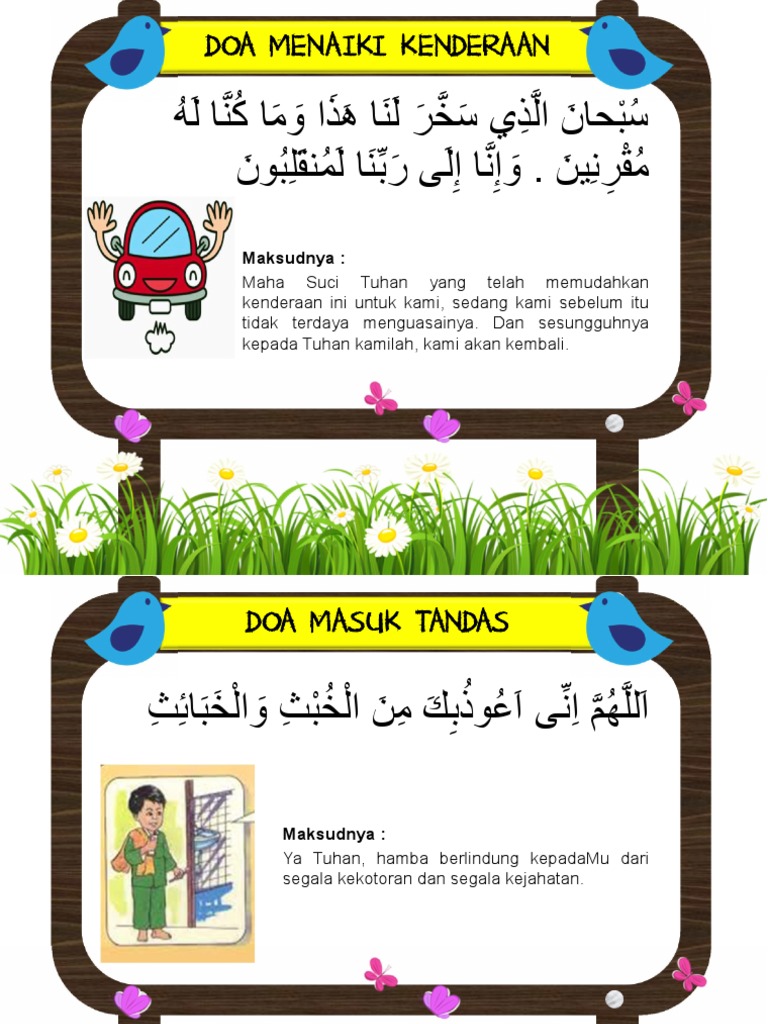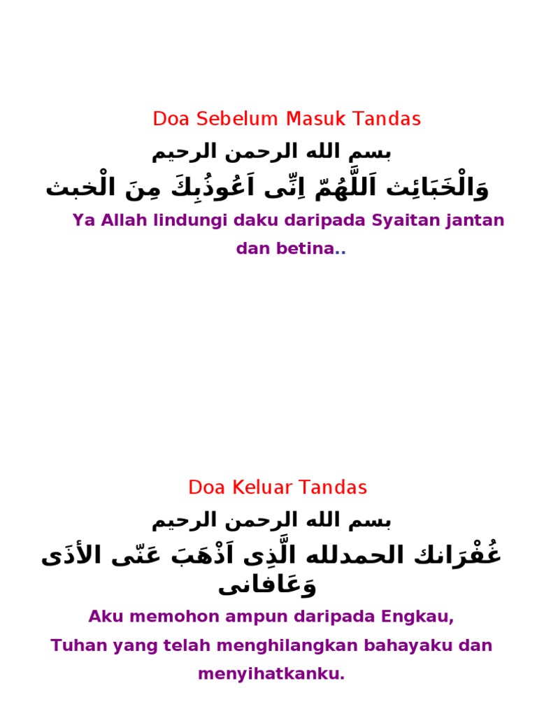 Alif dan sofia nak kongsikan cara yang mudah untuk kita hafal dengan irama yang ringkas. Kumpulan 5 doa sebelum belajar ini bisa di pakai oleh kita, baik itu mempelajari ilmu agama maupun mempelajari ilmu dunia, walaupun prinisipnya mempelajari ilmu agama adalah hal yang wajib kita lakukan dan ilmu tentang dunia adalah mubah. Mendahulukan kaki kiri sebelum masuk tandas. Selain doa masuk bilik air atau adab masuk tandas yang perlu kita tahu, adab ketika berada di dalam tandas juga wajib kita ketahui agar semua ibadah kita sempurna dan suci dari di antara adab masuk tandas yang saya belajar dengan guru saya suatu masa dahulu, dan belum dapat lagi di tempat lain. Doa selepas membaca tasyahud akhir sebelum salam.