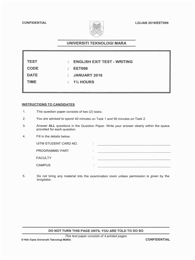 English Exit Test Uitm : A conversation with madam goldie olszynko about english placement test and english exit exam.. Learn what your english level is and study accordingly. To gauge your english language readiness for the workplace. Studying english exit test at universiti teknologi mara? Descriptions of levels for uitm english exit test (eet) eet699 1 level 2 2cefr overall written production overall spoken production 6 ser c2 can write clear, smoothly flowing, complex texts in an appropriate and effective style and a logical structure which helps the reader to find significant points. A conversation with madam goldie olszynko about english placement test and english exit exam.