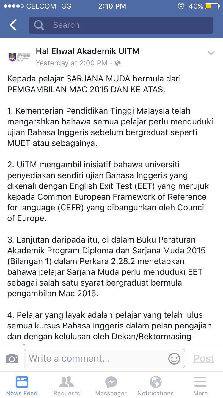 Measurement assessment and evaluation in education drjj uitm. That's enough to think of the answers carefully. Video ini adalah milik uitm sepenuhnya. Exercise for exit test (part 1) from the longman online dictionary of contemporary english. Mr francis xavier a.s.rajoo ketua jk eet 699 (english exit test) room no. Descriptions of levels for uitm english exit test (eet) eet699 1 level 2 2cefr overall written production overall spoken production 6 ser c2 can write clear, smoothly flowing, complex texts in an appropriate and effective style and a logical structure which helps the reader to find significant points. Do not press the finish button before you are sure in your answers. Descriptions of levels for uitm english exit test (eet) eet699 1 level 2 2cefr overall written production overall spoken production 6 ser c2 can write clear, smoothly flowing, complex texts in an appropriate and effective style and a logical structure which helps the reader to find significant points. You must make an appointment by email before. Pdf english exit test eet and competence based english test cbet as verbal competence measures for employability a comparative systematic review. Tahun akan datang kena semak semula dengan jadual hea uitm. Saya hanya share di sini untuk mereka yang tiada bandwith untuk download video. Kalau tak, kira tak boleh graduate course ni pada tahun 2020 masih lagi macam tu.