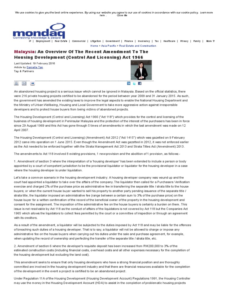 Housing Development Control And Licensing Amendment Act Pdf Free Download from docplayer.net All property development that falls under housing development act (hda) must comply to rules stated in housing development act (hda). The housing development act was established in 1966. Ever wondered how safe it is for own stay/investment when it comes to buying properties in malaysia? This act has been updated several times to keep it in sync with the existing challenges of home buyers. [throughout malaysia�15 april 1966, p.u. Housing developers (housing development account) (amendment) regulations 2002. Apart from the protection for residential title house buyers, this act also provides protection to certain commercial title new projects, eg: Malaysian act providing control and licensing of the business of housing development in peninsular malaysia, the protection of the interest of purchases and for matters connected therewith.