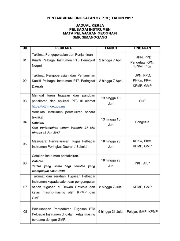 Jadual Kerja Pt3 2018 from pekeliling.com Apakah tajuk kerja kursus atau tugasan geografi pt3 tahun 2018? Format penulisan kerja kursus geografi pt3. Berdasarkan pengumuman oleh lembaga peperiksaan malaysia, calon pt3 tahun ini telah ditugaskan untuk menajalani tugasan ujian pelbagai instrumen geografi dengan membuat tugasan kerja khusus untuk mata pelajaran. Pekerjaan penduduk dalam pelbagai kegiatan ekonomi *lihat tugasan 2016: Contoh kaedah kajian geografi pt3 : Panduan buat pelajar tingkatan 3 yang perlu menyiapkan tugasan kerja kursus geografi pt3 (pelbagai instrumen) tahun 2021. Bahagian ini merupakan salah satu bahagian penting dalam penyediaan tugasan geografi pt3 2017 iaitu huraikan latar belakang ciri fizikal dan budaya kawasan kajian. Pt3 yang diperkenalkan pada tahun 2014 membuka lembaran baharu apabila tiada lagi soalan objektif dalam ujian bertulis bagi semua mata pelajaran, sebaliknya.