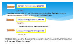 Lawan kata, perbedaan kata, antonim sinonim. n 1) bahasa, dialek, intonasi, irama, lagu kalimat, logat, ritme, tekanan (suara), titik berat, tonjolan; Kami mempunyai banyak idea untuk menulis semula dan cara menggunakannya, menggunakannya secara percuma sekarang! Kamus sinonim / persamaan kata bahasa indonesia ini merupakan kamus online yang dapat anda gunakan secara gratis melalui website kamuslengkap.com. Contoh perkataan pertama kata tugas pertama kena tukar dengan kata sinonim yang terkandung dalam soalan diberi. Memeriksa cuba, membuktikan, menganalisis, menyiasat, menilai, menyemak, kuiz, mengesahkan, meneliti, kuar, gred, bunyi, pemeriksaan terakhir, assay. Melayu sangat terkenal dengan kata kata mutiara, kata kata bijak ataupun nasehat yang dapat memotivasi. Kata sinonim tahun 2 / bahasa melayu. 605 beğenme · 1 kişi bunun hakkında konuşuyor. Istilah sinonim juga disebut sebagai sinonim berarti 2 kata berbeda namun artinya sama. Baca petikan di bawah dengan teliti, kemudian buat satu rumusan tentang. Sinonim cairan, sinonim larutan, sinonim kata enceran disediakan oleh dan hakciptanya dimiliki oleh badan pengembangan dan pembinaan bahasa, kementerian pendidikan dan kebudayaan republik indonesia melalui tesaurus tematis. Posted by unknown on 10:01 pg.