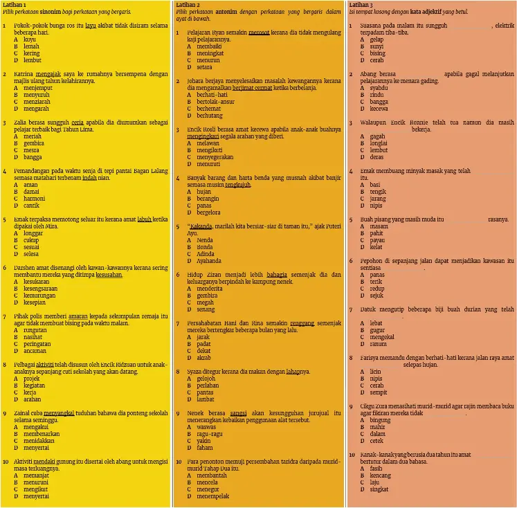 Learn vocabulary, terms and more with flashcards, games and other study tools. Synonym dari bahasa melayu atau persamaan kata. Persamaan kata, padanan kata, sinonim dari sinonim. Kata adjektif kata adjektif atau kata sifat ialah kata yang digunakan untuk menerangkan keadaan atau sifat sesuatu benda. Sebagai contoh perkataan jika sama ertinya dengan andai.