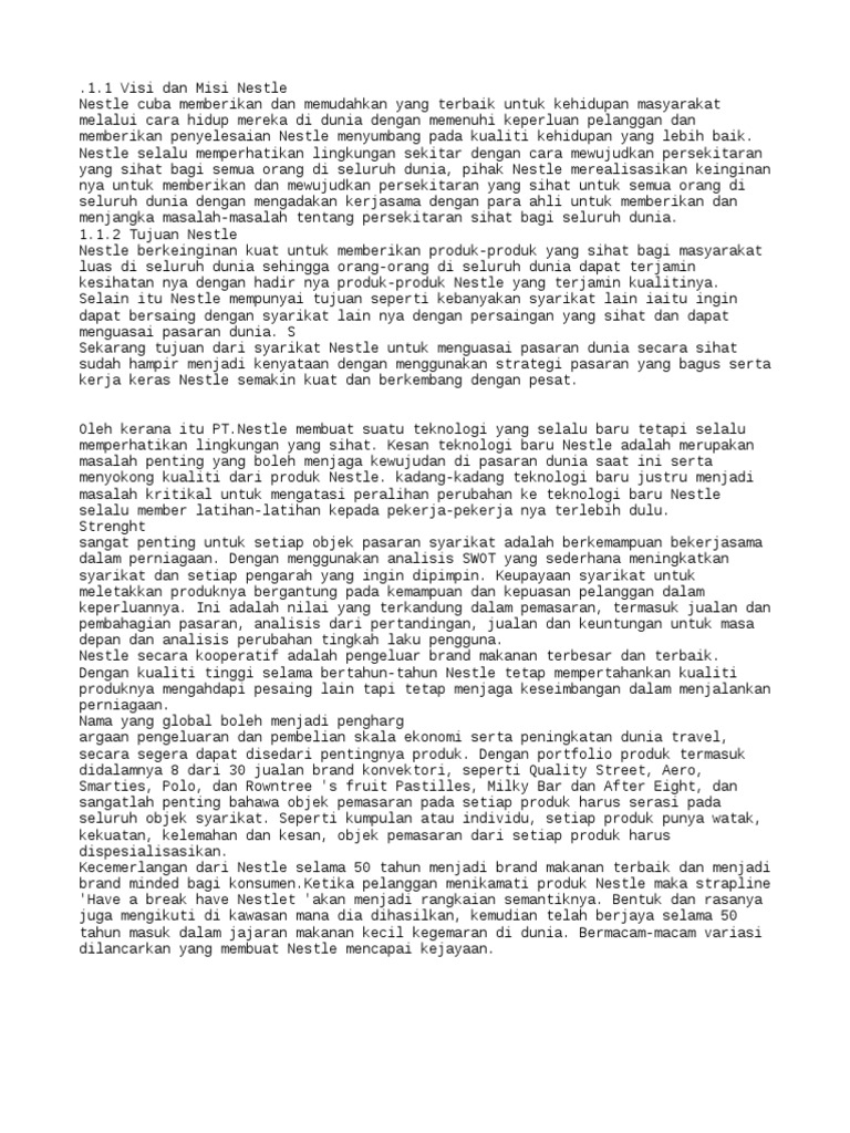 Visi Misi Dan Objektif Syarikat Nestle - Para karyawan kami berdedikasi dan termotivasi untuk memproduksi produk.. Memberikan layanan yang sopan terhadap pelanggan. • merupakan satu pernyataan ringkas tentang matlamat utama penubuhan organisasi. Misi dan visi syarikat misi dengan tekad untuk berkembang maju seiring peredaran masa perniagaan telah mengarikan beberapa misi berikut bagi mancapai cita cita dan halatuju dengan misi. Dalam menjalankan bisnisnya, nestle berusaha untuk selalu menjalankan tanggung jawab kepada. Perusahaan yang memilih misi dan visi yang jelas dapat mengkomunikasikan.