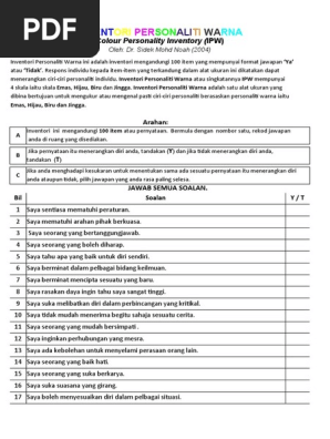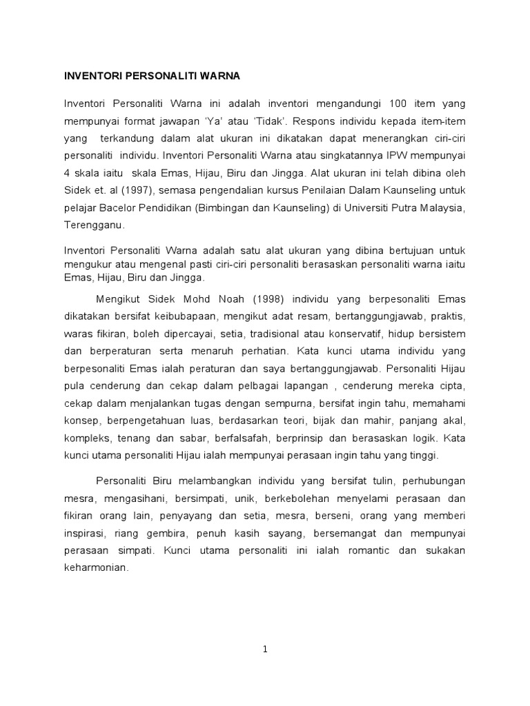 So please help us by uploading 1 new document or like us to download A inventori ini mengandungi 100. Ujian personaliti ialah alat ujian khusus yang digunakan untuk menentukan sejauh mana seseorang itu mempunyai tret atau ciri personaliti dengan menunjukkan sejauh manasamanya gerak balas yang diberikan oleh menggunakan pendekatan rasional oleh sidek mohd. Al soal selidik personaliti warna ipw bil. • 11 apakah personaliti anda? Pengenalan inventori personaliti warna (ipw). 2 apakah ipw… • mengandungi 100 item (format 'ya' atau 'tidak') • respons individu : Download inventori personaliti warna sidek. Supports and helps all colleagues on the job. Pentadbiran inventori personaliti sidek bagi menjawab inventori personaliti sidek ini, masa yang diperuntukkan adalah selama 20 hingga 30 minit. ● mengandungi 100 item yang mempunyai format 'ya' atau 'tidak'. Interpretasi inventori personaliti sidek (ips) personaliti sebagai organisasi sistem psikologikal yang dinamik di dalam jiwa individu. ● mempunyai 4 skala warna iaitu emas, biru, hijau dan jingga.