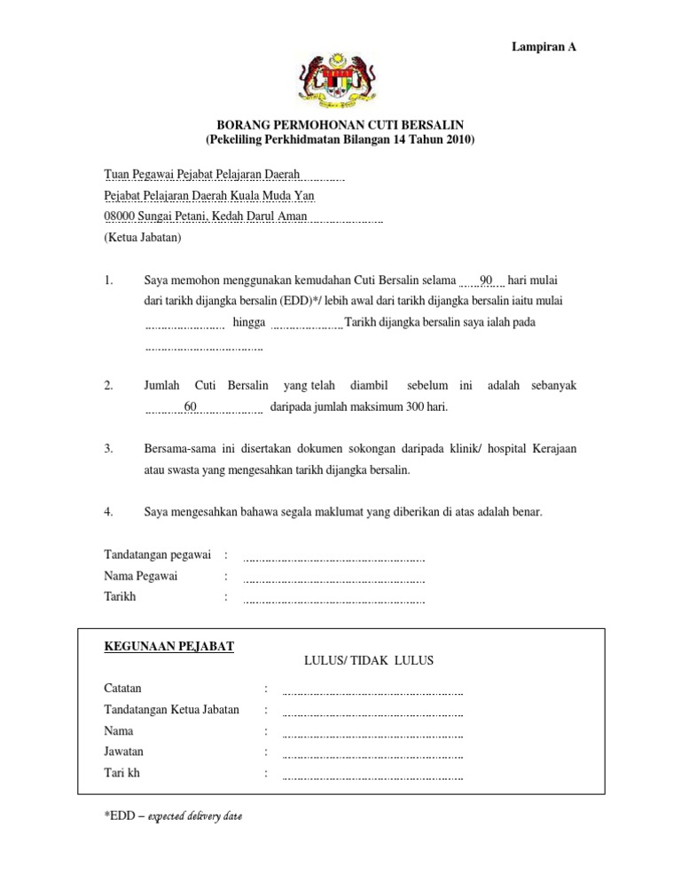 Surat pekeliling perkhidmatan bilangan 3 tahun 2011. 21 jun 2010 salinan kepada: Pekeliling perkhidmatan bilangan 2 tahun 1998 telah menetapkan bahawa kemudahan cuti bersalin kepada pegawai perkhidmatan awam persekutuan adalah selama 60 hari yang dikira mulai dari tarikh pegawai bersalin. Pekeliling perkhidmatan bilangan 1 tahun 2010. Pembentukan gred jawatan/ gred gaji baru ini adalah berdasarkan kombinasi antara kod kelayakan masuk minimum dengan kod gaji.